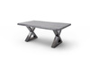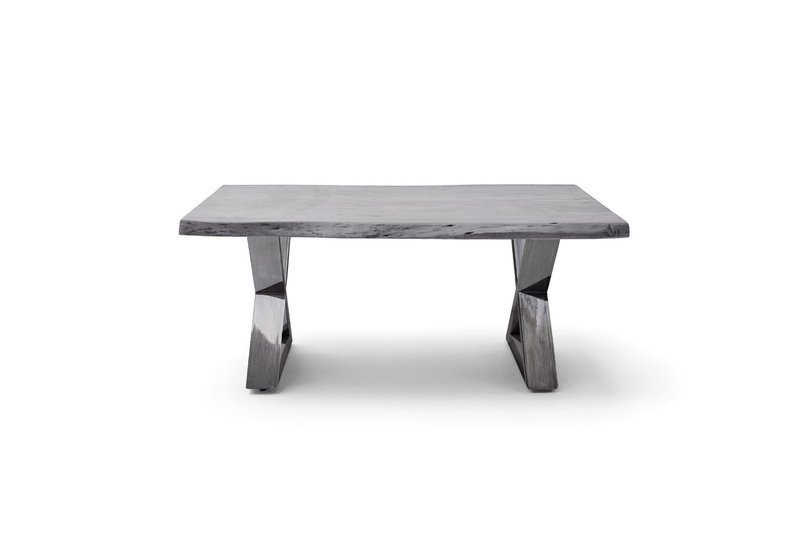 Stolik kawowy prostokątny, drewno akacjowe, kolor szary przecierany, lakier, obrzeże ciosane, stelaż typu krzyżak, metal lakier antyczny przecierany.