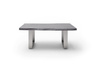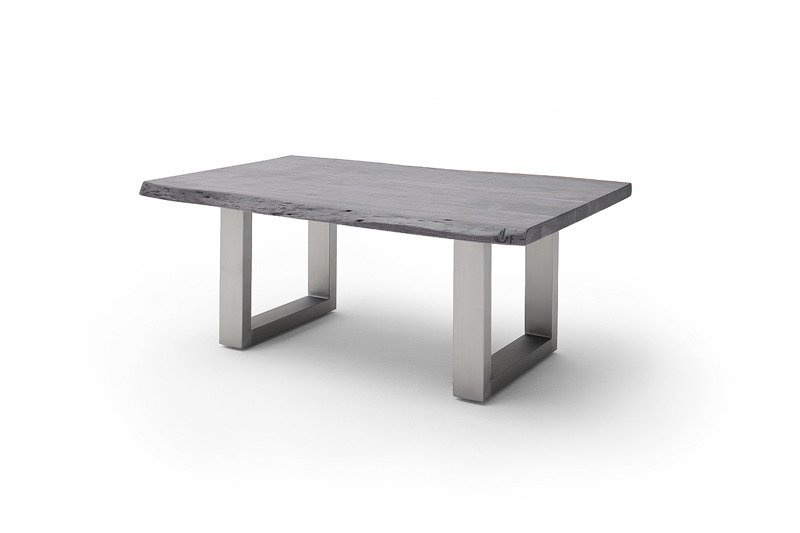 Stolik kawowy prostokątny, drewno akacjowe, kolor szary przecierany, lakier, obrzeże ciosane, stelaż typu "U", stal szlachetna szczotkowana