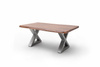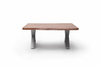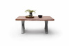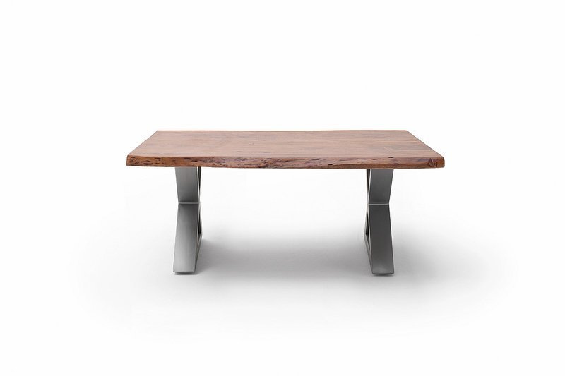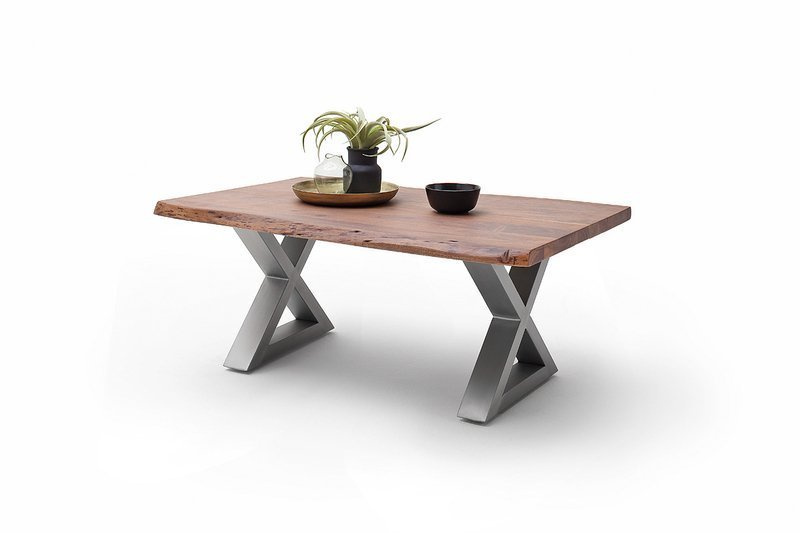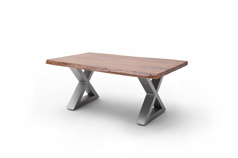 Stolik kawowy prostokątny, drewno akacjowe, kolor orzech, lakier, obrzeże ciosane, stelaż typu krzyżak, stal szlachetna szczotkowana.