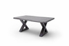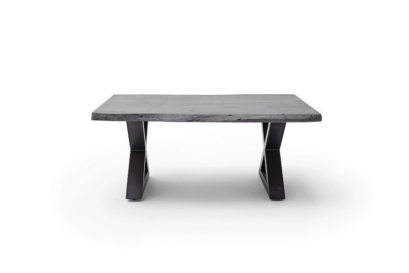 Stolik kawowy prostokątny, drewno akacjowe, kolor szary przecierany, lakier, obrzeże ciosane, stelaż typu krzyżak, metal lakier antracyt mat.