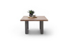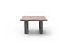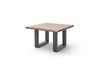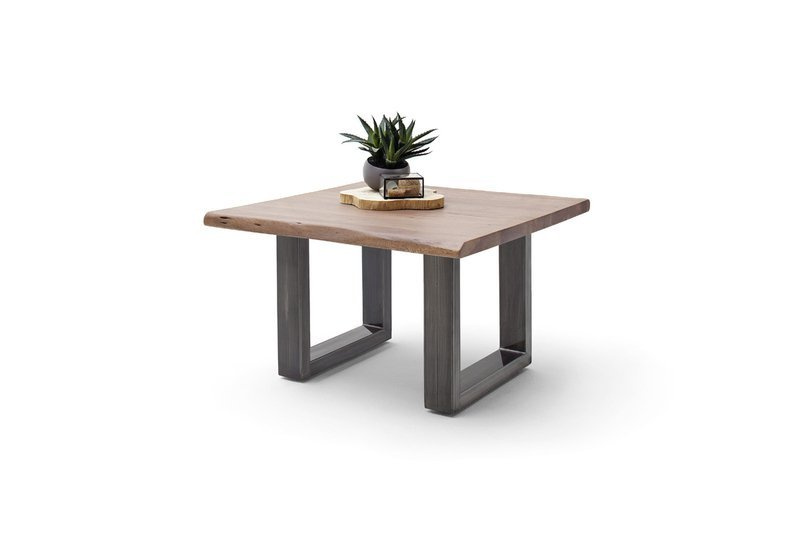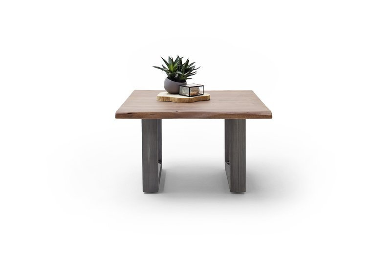 Stolik kawowy kwadratowy, drewno akacjowe, kolor orzech, lakier, obrzeże ciosane, stelaż typu "U", metal lakier antyczny przecierany