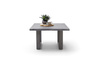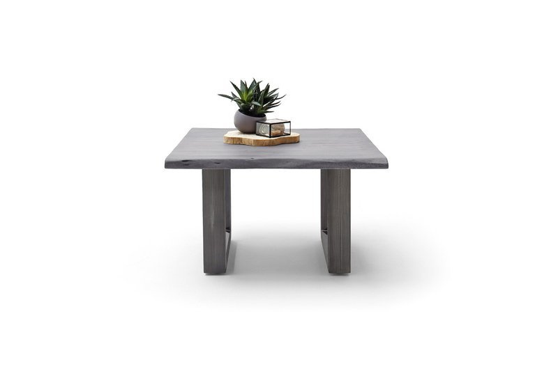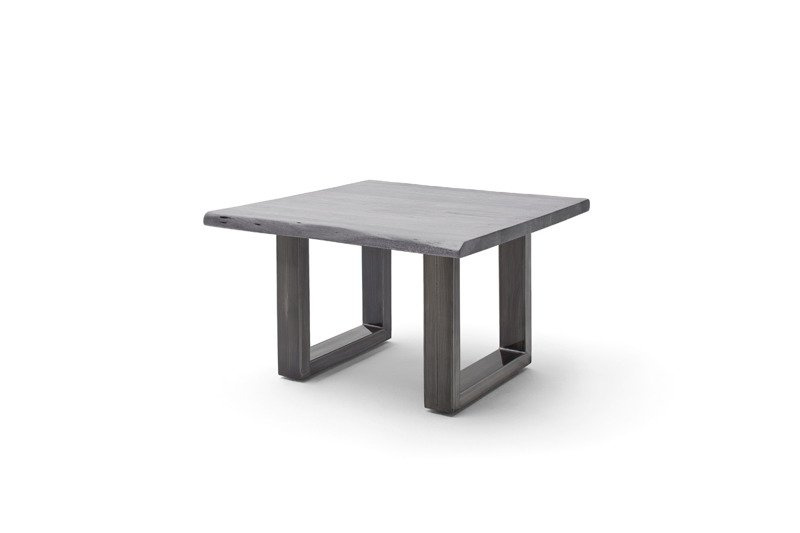 Stolik kawowy kwadratowy, drewno akacjowe, kolor szary przecierany, lakier, obrzeże ciosane, stelaż typu "U", metal lakier antyczny przecierany