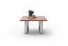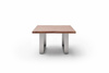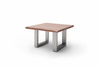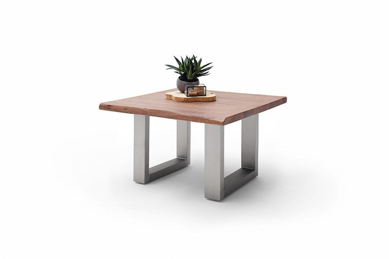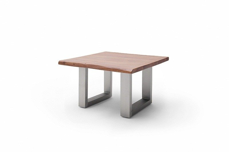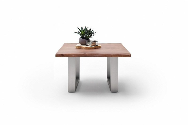 Stolik kawowy kwadratowy, drewno akacjowe, kolor orzech, lakier, obrzeże ciosane, stelaż typu "U", stal szlachetna szczotkowana.