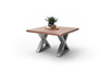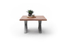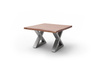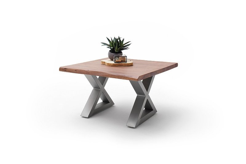 Stolik kawowy kwadratowy, drewno akacjowe, kolor orzech, lakier, obrzeże ciosane, stelaż typu krzyżak, stal szlachetna szczotkowana