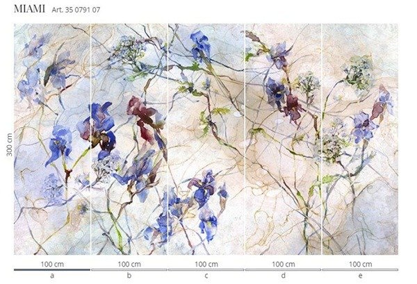 Murale marki Wonderwall sprzedajemy w rolkach o standardowych wymiarach: 100 cm x 300 cm. Jeśli wysokość waszego pomieszczenia jest mniejsza niż 3 metry, wówczas nadmiar tapety należy w odpowiednim miejscu odciąć. Na pełny wzór składa się pięć rolek: a, b, c, d i e. Można wybrać konkretne rolki dopasowując tapetę do swojego wnętrza. Lub można przygotować mural pod konkretny wymiar. W tym celu prosimy o kontakt pod mail sklep@iguane.pl