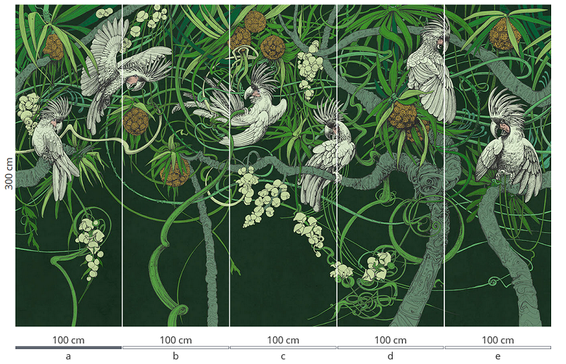 Murale marki Wonderwall sprzedajemy w rolkach o standardowych wymiarach: 100 cm x 300 cm. Jeśli wysokość waszego pomieszczenia jest mniejsza niż 3 metry, wówczas nadmiar tapety należy w odpowiednim miejscu odciąć. Na pełny wzór składa się pięć rolek: a, b, c, d i e. Można wybrać konkretne rolki dopasowując tapetę do swojego wnętrza. Lub można przygotować mural pod konkretny wymiar. W tym celu prosimy o kontakt pod mail sklep@iguane.pl
