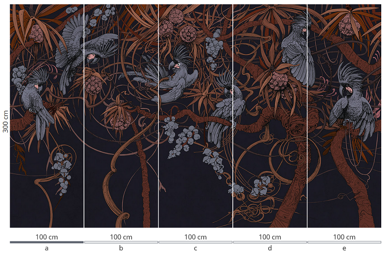 Murale marki Wonderwall sprzedajemy w rolkach o standardowych wymiarach: 100 cm x 300 cm. Jeśli wysokość waszego pomieszczenia jest mniejsza niż 3 metry, wówczas nadmiar tapety należy w odpowiednim miejscu odciąć. Na pełny wzór składa się pięć rolek: a, b, c, d i e. Można wybrać konkretne rolki dopasowując tapetę do swojego wnętrza. Lub można przygotować mural pod konkretny wymiar. W tym celu prosimy o kontakt pod mail sklep@iguane.pl