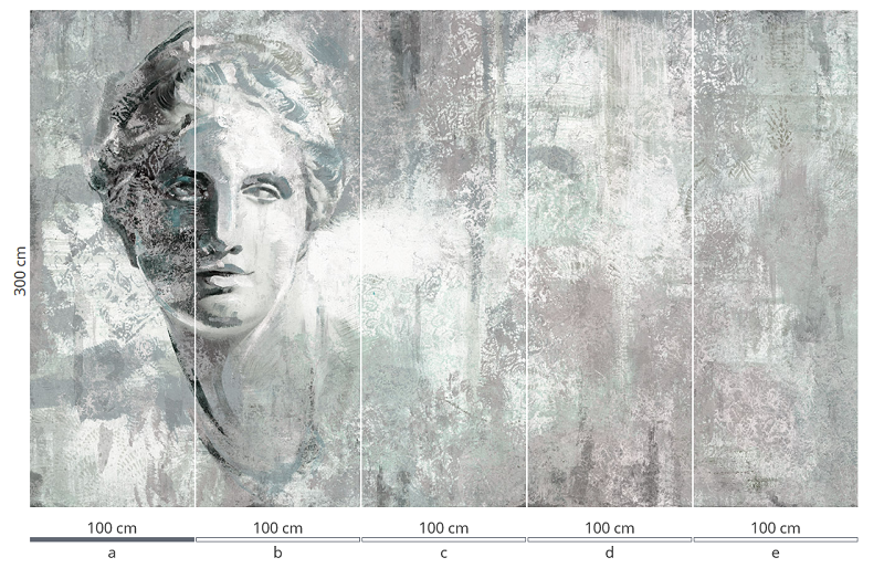 Murale marki Wonderwall sprzedajemy w rolkach o standardowych wymiarach: 100 cm x 300 cm. Jeśli wysokość waszego pomieszczenia jest mniejsza niż 3 metry, wówczas nadmiar tapety należy w odpowiednim miejscu odciąć. Na pełny wzór składa się pięć rolek: a, b, c, d i e. Można wybrać konkretne rolki dopasowując tapetę do swojego wnętrza. Lub można przygotować mural pod konkretny wymiar. W tym celu prosimy o kontakt pod mail sklep@iguane.pl