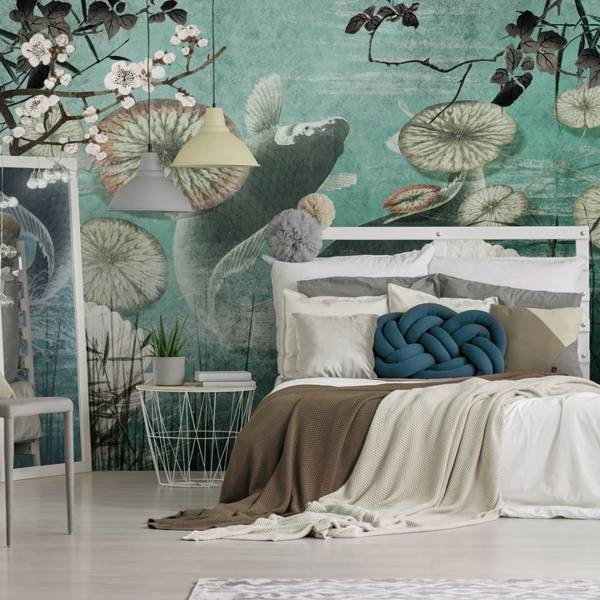 Tapeta inspirowana dalekim wschodem. Japońska ryba KOI symbolizuje powodzenie w interesach i dostatek, ale również męstwo i przezwyciężanie wszelkich trudności. Piękne odwzorowanie ryby w jej naturalnym środowisku, z lilami, trzciną i kwitnącą wiśnią.