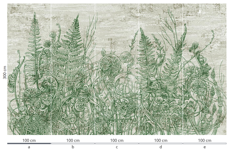 Murale marki Wonderwall sprzedajemy w rolkach o standardowych wymiarach: 100 cm x 300 cm. Jeśli wysokość waszego pomieszczenia jest mniejsza niż 3 metry, wówczas nadmiar tapety należy w odpowiednim miejscu odciąć. Na pełny wzór składa się pięć rolek: a, b, c, d i e. Można wybrać konkretne rolki dopasowując tapetę do swojego wnętrza. Lub można przygotować mural pod konkretny wymiar. W tym celu prosimy o kontakt pod mail sklep@iguane.pl