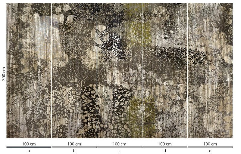 Murale marki Wonderwall sprzedajemy w rolkach o standardowych wymiarach: 100 cm x 300 cm. Jeśli wysokość waszego pomieszczenia jest mniejsza niż 3 metry, wówczas nadmiar tapety należy w odpowiednim miejscu odciąć. Na pełny wzór składa się pięć rolek: a, b, c, d i e. Można wybrać konkretne rolki dopasowując tapetę do swojego wnętrza. Lub można przygotować mural pod konkretny wymiar. W tym celu prosimy o kontakt pod mail sklep@iguane.pl