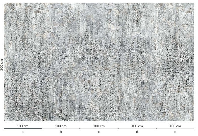 Murale marki Wonderwall sprzedajemy w rolkach o standardowych wymiarach: 100 cm x 300 cm. Jeśli wysokość waszego pomieszczenia jest mniejsza niż 3 metry, wówczas nadmiar tapety należy w odpowiednim miejscu odciąć. Na pełny wzór składa się pięć rolek: a, b, c, d i e. Można wybrać konkretne rolki dopasowując tapetę do swojego wnętrza. Lub można przygotować mural pod konkretny wymiar. W tym celu prosimy o kontakt pod mail sklep@iguane.pl