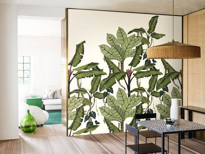 Panorama Jangala przenosi nas w stylizowaną dżunglę, między kolokazjami i bananowcami. Ich kwiatostany, wdzięczne jak deszcz roślin, wydają się próbować przedrzeć się między roślinami tropikalnymi.