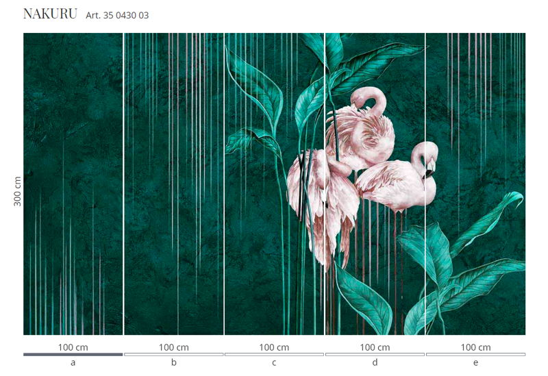 Murale marki Wonderwall sprzedajemy w rolkach o standardowych wymiarach: 100 cm x 300 cm. Jeśli wysokość waszego pomieszczenia jest mniejsza niż 3 metry, wówczas nadmiar tapety należy w odpowiednim miejscu odciąć. Na pełny wzór składa się pięć rolek: a, b, c, d i e. Można wybrać konkretne rolki dopasowując tapetę do swojego wnętrza. Lub można przygotować mural pod konkretny wymiar. W tym celu prosimy o kontakt pod mail sklep@iguane.pl