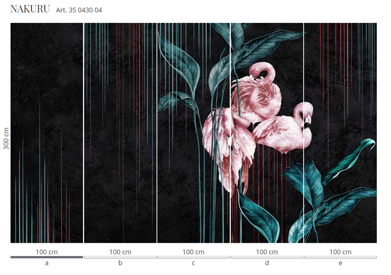 Murale marki Wonderwall sprzedajemy w rolkach o standardowych wymiarach: 100 cm x 300 cm. Jeśli wysokość waszego pomieszczenia jest mniejsza niż 3 metry, wówczas nadmiar tapety należy w odpowiednim miejscu odciąć. Na pełny wzór składa się pięć rolek: a, b, c, d i e. Można wybrać konkretne rolki dopasowując tapetę do swojego wnętrza. Lub można przygotować mural pod konkretny wymiar. W tym celu prosimy o kontakt pod mail sklep@iguane.pl
