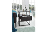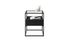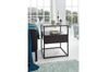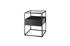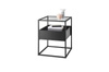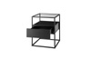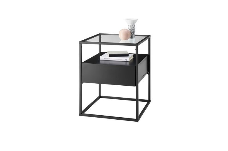 Nowoczesny stolik ze szklanym blatem i funkcjonalną szufladą. Metalowy stelaż tworzy minimalistyczną, lekką formę.