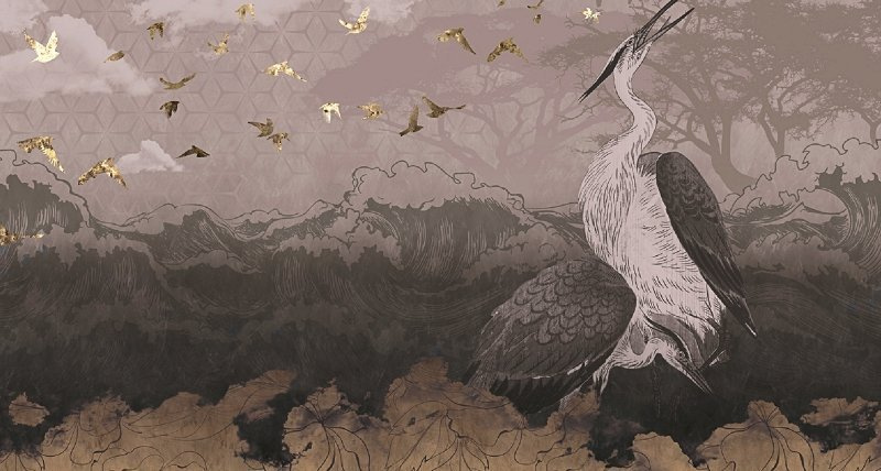 Przepiękny mural Yanya inspirowany naturą przywodzi na myśl azjatyckie wybrzeże. Majestatyczna czaple na tle wzburzonego morza przyciągają wzrok. W wersji metalicznej w oddali połyskują unoszące się nad falami ptaki. Im dłużej patrzymy, zauważamy kolejne plany muralu, rozłożyste drzewa, chmury, delikatna geometria.