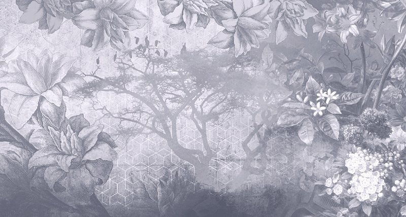 Różnorodne graficznie, bujne kwiaty na pierwszym planie kryją w głębi rozłożyste drzewo. Wszystko dodatkowo wzbogacone łagodną geometrią. Kolorystyk oraz styl zachwyca od pierwszego rzutu okiem. Mural Spirits nie jest zwyczajną, kwiecistą ozdobą ściany.