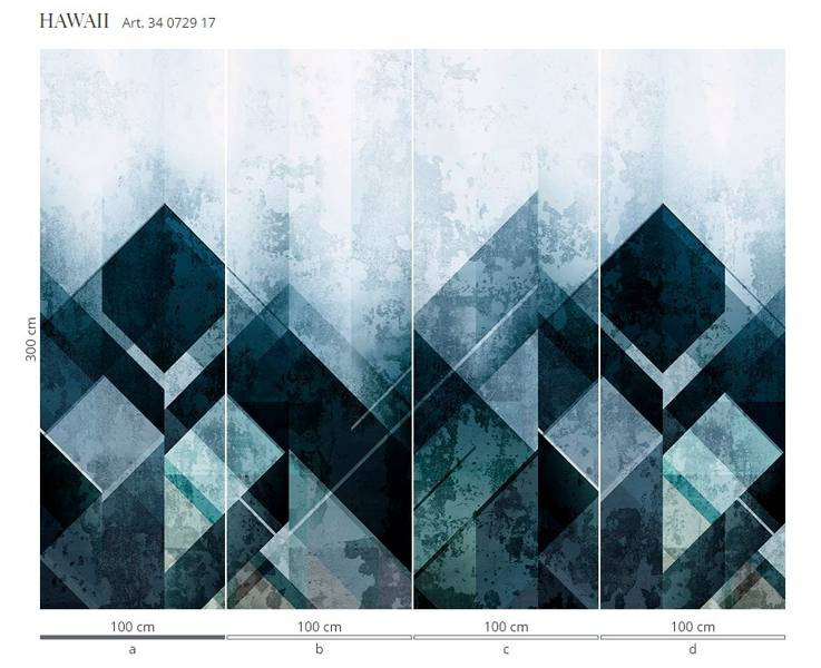 Murale marki Wonderwall sprzedajemy w rolkach o standardowych wymiarach: 100 cm x 300 cm. Jeśli wysokość waszego pomieszczenia jest mniejsza niż 3 metry, wówczas nadmiar tapety należy w odpowiednim miejscu odciąć. Na pełny wzór składa się pięć rolek: a, b, c, d i e. Można wybrać konkretne rolki dopasowując tapetę do swojego wnętrza. Lub można przygotować mural pod konkretny wymiar. W tym celu prosimy o kontakt pod mail sklep@iguane.pl
