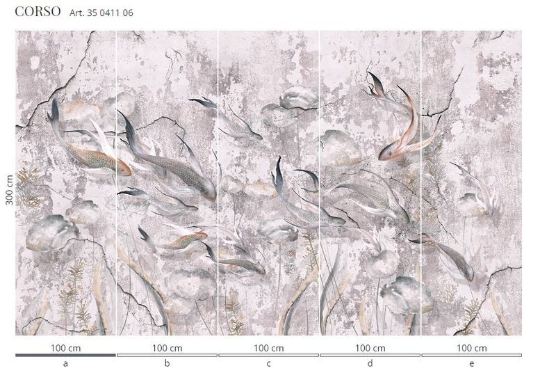 Murale marki Wonderwall sprzedajemy w rolkach o standardowych wymiarach: 100 cm x 300 cm. Jeśli wysokość waszego pomieszczenia jest mniejsza niż 3 metry, wówczas nadmiar tapety należy w odpowiednim miejscu odciąć. Na pełny wzór składa się pięć rolek: a, b, c, d i e. Można wybrać konkretne rolki dopasowując tapetę do swojego wnętrza. Lub można przygotować mural pod konkretny wymiar. W tym celu prosimy o kontakt pod mail sklep@iguane.pl