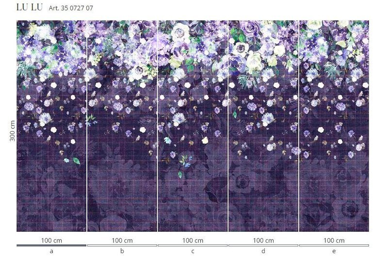 Murale marki Wonderwall sprzedajemy w rolkach o standardowych wymiarach: 100 cm x 300 cm. Jeśli wysokość waszego pomieszczenia jest mniejsza niż 3 metry, wówczas nadmiar tapety należy w odpowiednim miejscu odciąć. Na pełny wzór składa się pięć rolek: a, b, c, d i e. Można wybrać konkretne rolki dopasowując tapetę do swojego wnętrza. Lub można przygotować mural pod konkretny wymiar. W tym celu prosimy o kontakt pod mail sklep@iguane.pl