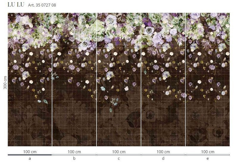 Murale marki Wonderwall sprzedajemy w rolkach o standardowych wymiarach: 100 cm x 300 cm. Jeśli wysokość waszego pomieszczenia jest mniejsza niż 3 metry, wówczas nadmiar tapety należy w odpowiednim miejscu odciąć. Na pełny wzór składa się pięć rolek: a, b, c, d i e. Można wybrać konkretne rolki dopasowując tapetę do swojego wnętrza. Lub można przygotować mural pod konkretny wymiar. W tym celu prosimy o kontakt pod mail sklep@iguane.pl