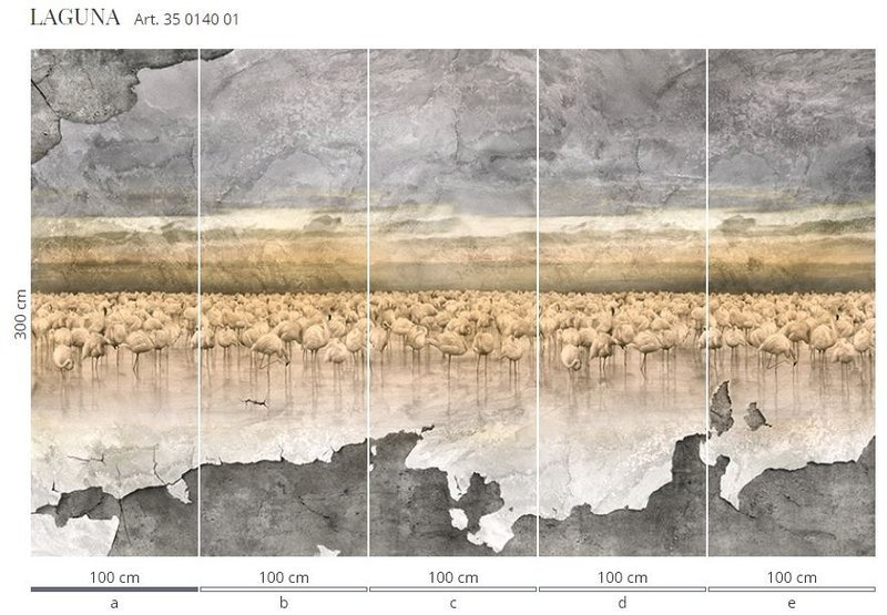 Murale marki Wonderwall sprzedajemy w rolkach o standardowych wymiarach: 100 cm x 300 cm. Jeśli wysokość waszego pomieszczenia jest mniejsza niż 3 metry, wówczas nadmiar tapety należy w odpowiednim miejscu odciąć. Na pełny wzór składa się pięć rolek: a, b, c, d i e. Można wybrać konkretne rolki dopasowując tapetę do swojego wnętrza. Lub można przygotować mural pod konkretny wymiar. W tym celu prosimy o kontakt pod mail sklep@iguane.pl