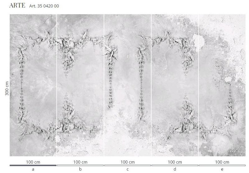 Murale marki Wonderwall sprzedajemy w rolkach o standardowych wymiarach: 100 cm x 300 cm. Jeśli wysokość waszego pomieszczenia jest mniejsza niż 3 metry, wówczas nadmiar tapety należy w odpowiednim miejscu odciąć. Na pełny wzór składa się pięć rolek: a, b, c, d i e. Można wybrać konkretne rolki dopasowując tapetę do swojego wnętrza. Lub można przygotować mural pod konkretny wymiar. W tym celu prosimy o kontakt pod mail sklep@iguane.pl