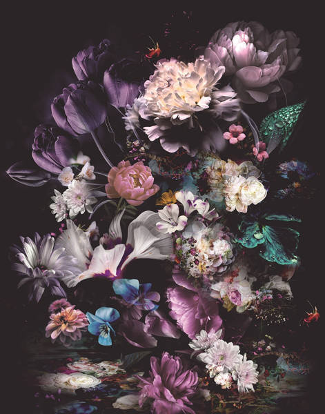 Piękny mural inspirowany bukietem kwiatów - piwonii, tulipanów, bratków. Kwiecista kompozycja na czarnym tle wygląda realistycznie i bardzo elegancko. Nadaje wnętrzu głębi i intensywności.