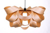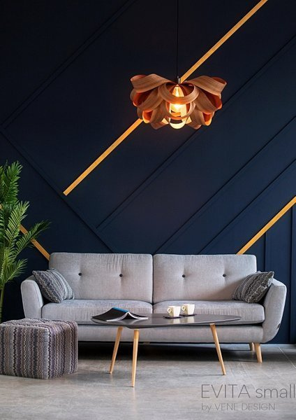 Okazała lampa Evita została wykonana z naturalnego forniru. Ręcznie robiony klosz z cienkich pasków forniru, które najpierw zostały starannie wycięte i oszlifowane, a następnie ręcznie uformowane w celu uzyskania przestrzennej tekstury. Abażur ma średnicę 76 cm i wysokość 33 cm i doskonale sprawdzi się w dużych pomieszczeniach jak salon, pokój sypialny czy hall. Sprzedawany w komplecie z czarnym lub białym zestawem sufitowym.