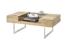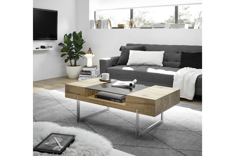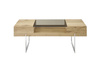 • Stolik kawowy okleina dąb sękaty olejowana i szkło, noga optyka stal szlachetna