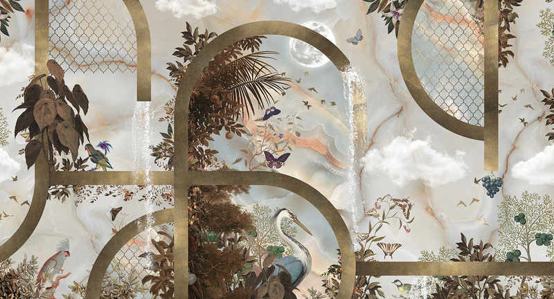 Okazały mural Classic Gold ma w sobie wiele ze stylu Art Deco. Gigantyczne, złote łuki na marmurowym tle wzbogacone zostały bujną roślinnością oraz ptakami czy motylami. Wyrazisty i wyrafinowany wzór przyciąga uwagę jak magnes. Mural ten idealnie sprawdzi się w reprezentacyjnych miejscach jak hol czy salon, ale także wprowadzi niezwykłą atmosferę w sypialni czy łazience.