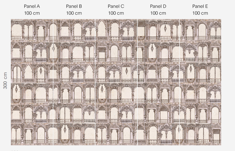 Murale marki Wonderwall sprzedajemy w rolkach o standardowych wymiarach: 100 cm x 300 cm. Jeśli wysokość waszego pomieszczenia jest mniejsza niż 3 metry, wówczas nadmiar tapety należy w odpowiednim miejscu odciąć. Na pełny wzór składa się pięć rolek: a, b, c, d i e. Można wybrać konkretne rolki dopasowując tapetę do swojego wnętrza. Lub można przygotować mural pod konkretny wymiar. W tym celu prosimy o kontakt pod mail sklep@iguane.pl