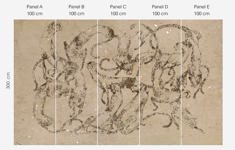Murale marki Wonderwall sprzedajemy w rolkach o standardowych wymiarach: 100 cm x 300 cm. Jeśli wysokość waszego pomieszczenia jest mniejsza niż 3 metry, wówczas nadmiar tapety należy w odpowiednim miejscu odciąć. Na pełny wzór składa się pięć rolek: a, b, c, d i e. Można wybrać konkretne rolki dopasowując tapetę do swojego wnętrza. Lub można przygotować mural pod konkretny wymiar. W tym celu prosimy o kontakt pod mail sklep@iguane.pl