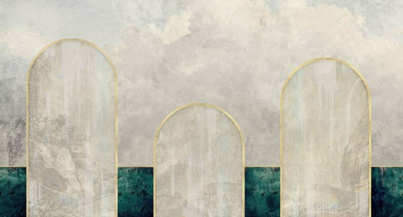 Eklektyczny mural Story of three wprowadza klimat art deco. Piękne złote łuki, w których w głębi kryją się subtelne krajobrazy, wnoszą spokój do wnętrza. a w połaczeniu ze zdecydowanymi, wyrazistymi kolorami dodają wyrafinowania. Mural ten idealnie sprawdzi się w sypialni czy łazience, ale także jadalni czy salonie.
