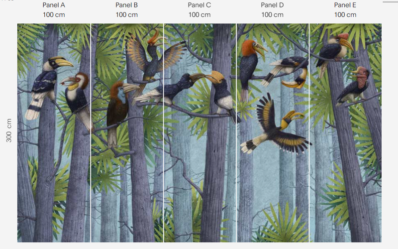 Murale marki Wonderwall sprzedajemy w rolkach o standardowych wymiarach: 100 cm x 300 cm. Jeśli wysokość waszego pomieszczenia jest mniejsza niż 3 metry, wówczas nadmiar tapety należy w odpowiednim miejscu odciąć. Na pełny wzór składa się pięć rolek: a, b, c, d i e. Można wybrać konkretne rolki dopasowując tapetę do swojego wnętrza. Lub można przygotować mural pod konkretny wymiar. W tym celu prosimy o kontakt pod mail sklep@iguane.pl