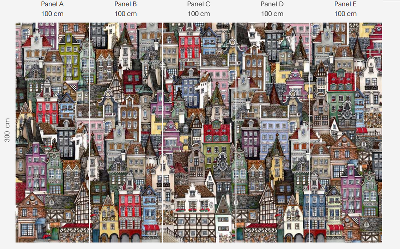 Murale marki Wonderwall sprzedajemy w rolkach o standardowych wymiarach: 100 cm x 300 cm. Jeśli wysokość waszego pomieszczenia jest mniejsza niż 3 metry, wówczas nadmiar tapety należy w odpowiednim miejscu odciąć. Na pełny wzór składa się pięć rolek: a, b, c, d i e. Można wybrać konkretne rolki dopasowując tapetę do swojego wnętrza. Lub można przygotować mural pod konkretny wymiar. W tym celu prosimy o kontakt pod mail sklep@iguane.pl