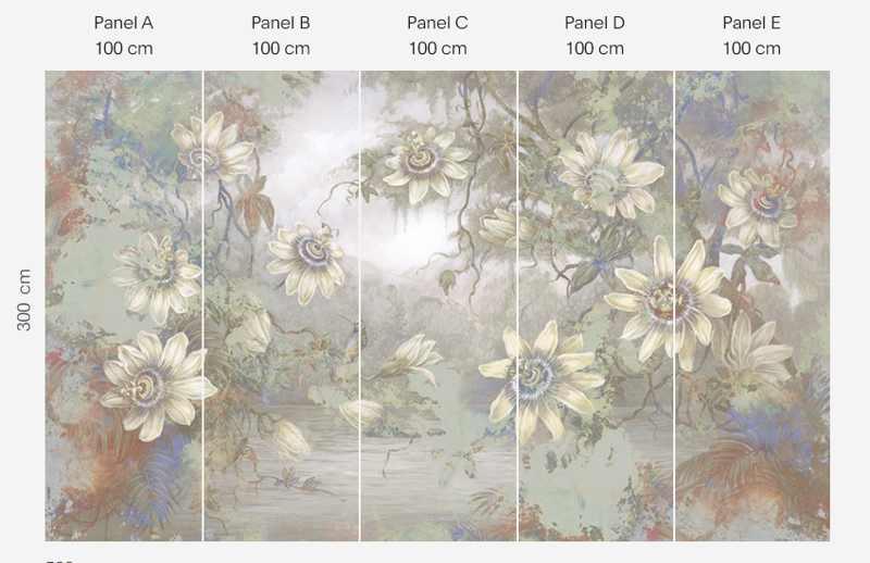 Murale marki Wonderwall sprzedajemy w rolkach o standardowych wymiarach: 100 cm x 300 cm. Jeśli wysokość waszego pomieszczenia jest mniejsza niż 3 metry, wówczas nadmiar tapety należy w odpowiednim miejscu odciąć. Na pełny wzór składa się pięć rolek: a, b, c, d i e. Można wybrać konkretne rolki dopasowując tapetę do swojego wnętrza. Lub można przygotować mural pod konkretny wymiar. W tym celu prosimy o kontakt pod mail sklep@iguane.pl