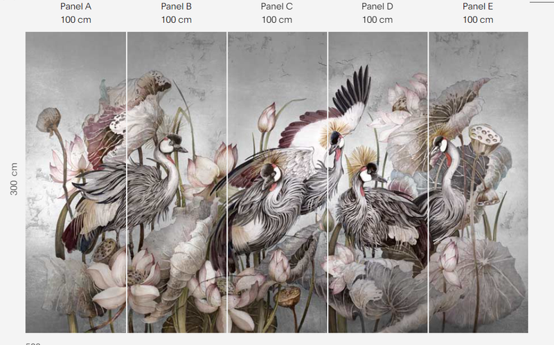 Murale marki Wonderwall sprzedajemy w rolkach o standardowych wymiarach: 100 cm x 300 cm. Jeśli wysokość waszego pomieszczenia jest mniejsza niż 3 metry, wówczas nadmiar tapety należy w odpowiednim miejscu odciąć. Na pełny wzór składa się pięć rolek: a, b, c, d i e. Można wybrać konkretne rolki dopasowując tapetę do swojego wnętrza. Lub można przygotować mural pod konkretny wymiar. W tym celu prosimy o kontakt pod mail sklep@iguane.pl