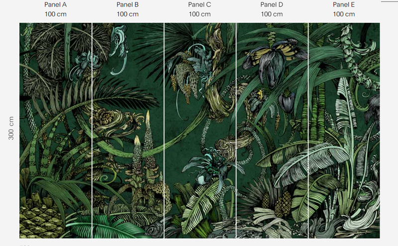 Murale marki Wonderwall sprzedajemy w rolkach o standardowych wymiarach: 100 cm x 300 cm. Jeśli wysokość waszego pomieszczenia jest mniejsza niż 3 metry, wówczas nadmiar tapety należy w odpowiednim miejscu odciąć. Na pełny wzór składa się pięć rolek: a, b, c, d i e. Można wybrać konkretne rolki dopasowując tapetę do swojego wnętrza. Lub można przygotować mural pod konkretny wymiar. W tym celu prosimy o kontakt pod mail sklep@iguane.pl