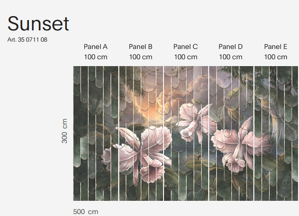 Murale marki Wonderwall sprzedajemy w rolkach o standardowych wymiarach: 100 cm x 300 cm. Jeśli wysokość waszego pomieszczenia jest mniejsza niż 3 metry, wówczas nadmiar tapety należy w odpowiednim miejscu odciąć. Na pełny wzór składa się pięć rolek: a, b, c, d i e. Można wybrać konkretne rolki dopasowując tapetę do swojego wnętrza. Lub można przygotować mural pod konkretny wymiar. W tym celu prosimy o kontakt pod mail sklep@iguane.pl