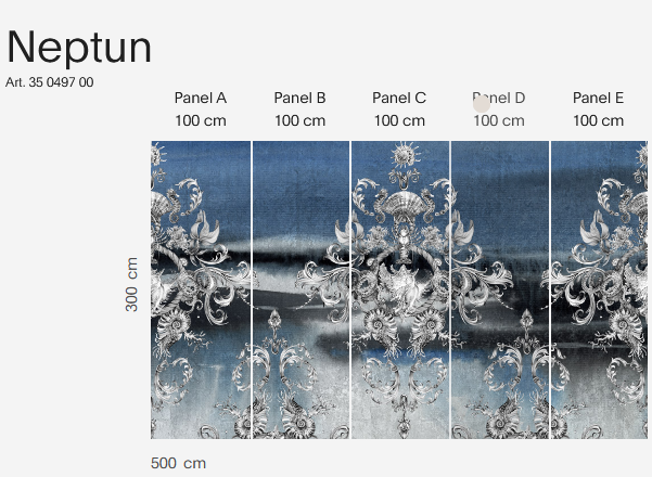Murale marki Wonderwall sprzedajemy w rolkach o standardowych wymiarach: 100 cm x 300 cm. Jeśli wysokość waszego pomieszczenia jest mniejsza niż 3 metry, wówczas nadmiar tapety należy w odpowiednim miejscu odciąć. Na pełny wzór składa się pięć rolek: a, b, c, d i e. Można wybrać konkretne rolki dopasowując tapetę do swojego wnętrza. Lub można przygotować mural pod konkretny wymiar. W tym celu prosimy o kontakt pod mail sklep@iguane.pl