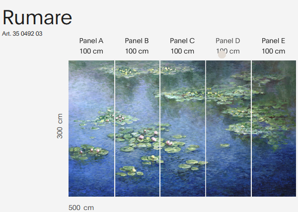 Murale marki Wonderwall sprzedajemy w rolkach o standardowych wymiarach: 100 cm x 300 cm. Jeśli wysokość waszego pomieszczenia jest mniejsza niż 3 metry, wówczas nadmiar tapety należy w odpowiednim miejscu odciąć. Na pełny wzór składa się pięć rolek: a, b, c, d i e. Można wybrać konkretne rolki dopasowując tapetę do swojego wnętrza. Lub można przygotować mural pod konkretny wymiar. W tym celu prosimy o kontakt pod mail sklep@iguane.pl