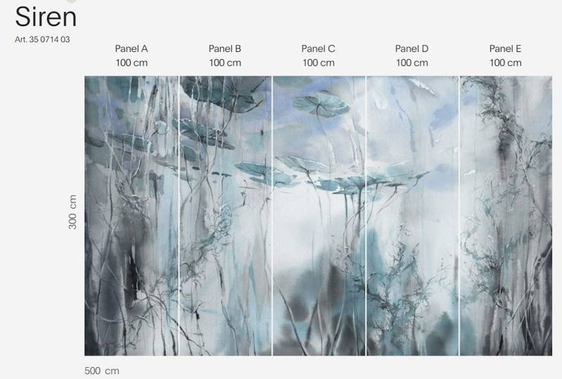 Murale marki Wonderwall sprzedajemy w rolkach o standardowych wymiarach: 100 cm x 300 cm. Jeśli wysokość waszego pomieszczenia jest mniejsza niż 3 metry, wówczas nadmiar tapety należy w odpowiednim miejscu odciąć. Na pełny wzór składa się pięć rolek: a, b, c, d i e. Można wybrać konkretne rolki dopasowując tapetę do swojego wnętrza. Lub można przygotować mural pod konkretny wymiar. W tym celu prosimy o kontakt pod mail sklep@iguane.pl