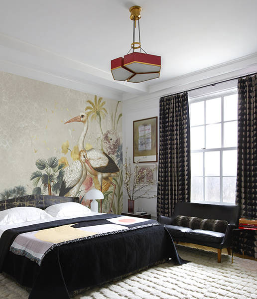 Bliskie naszym sercom bociany w otoczeniu pięknych kwiatów i egzotycznych drzew tworzą subtelny a zarazem sielski mural. Pełen detali oraz głębokich kolorów ożywia wnętrze i przyciąga naszą uwagę.