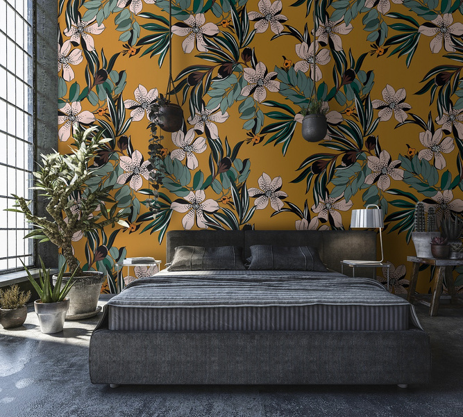 Ciemno miodowe tło, wręcz wpadające w lisi odcień rudości, zestawiono z pastelowo różowymi kwiatami, przeplecionymi z czekoladowym brązem i zieleniami. Ciepłe barwy na długo będą cieszyć oczy dzięki wysokiej odporności na działanie promieni słonecznych. Stworzy efektowną przestrzeń w domu, biurze lub restauracji.