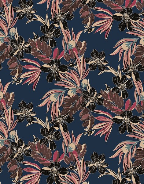 Zestawienie granatowego tła z czarnymi kwiatami wcale nie przytłacza dzięki przepleceniu ich z takimi kolorami jak czekoladowy brąz, malina i pudrowy róż. Ciepłe barwy na długo będą cieszyć oczy dzięki wysokiej odporności na działanie promieni słonecznych. Stworzy efektowną przestrzeń w domu, biurze lub restauracji.