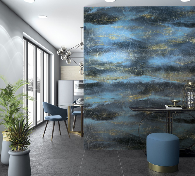 Niezwykły mural przedstawia zachmurzone niebiesko-czarne niebo. Okładzina jest lekko mroczna i bardzo nowoczesna, z wyczuwalną strukturą. Idealna do prostych, nowoczesnych wnętrz. Stworzy efektowną przestrzeń w domu, biurze lub restauracji.