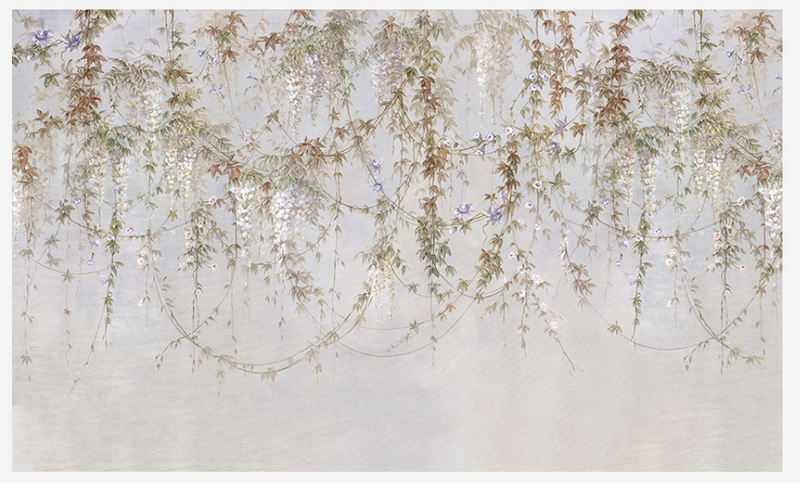 Mural Vitta dzięki stonowanym kolorom i eterycznej formie jest subtelną dekoracją wnętrza. Drobny wzór nie jest nachalny a jednak wyjątkowy. Idealnie nadaje się na ściany, przy których stoją meble. Wiszące pnącza pięknie się wkomponują w taką przestrzeń.