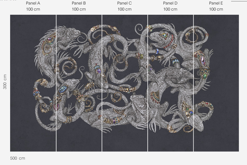 Murale marki Wonderwall sprzedajemy w rolkach o standardowych wymiarach: 100 cm x 300 cm. Jeśli wysokość waszego pomieszczenia jest mniejsza niż 3 metry, wówczas nadmiar tapety należy w odpowiednim miejscu odciąć. Na pełny wzór składa się pięć rolek: a, b, c, d i e. Można wybrać konkretne rolki dopasowując tapetę do swojego wnętrza. Lub można przygotować mural pod konkretny wymiar. W tym celu prosimy o kontakt pod mail sklep@iguane.pl